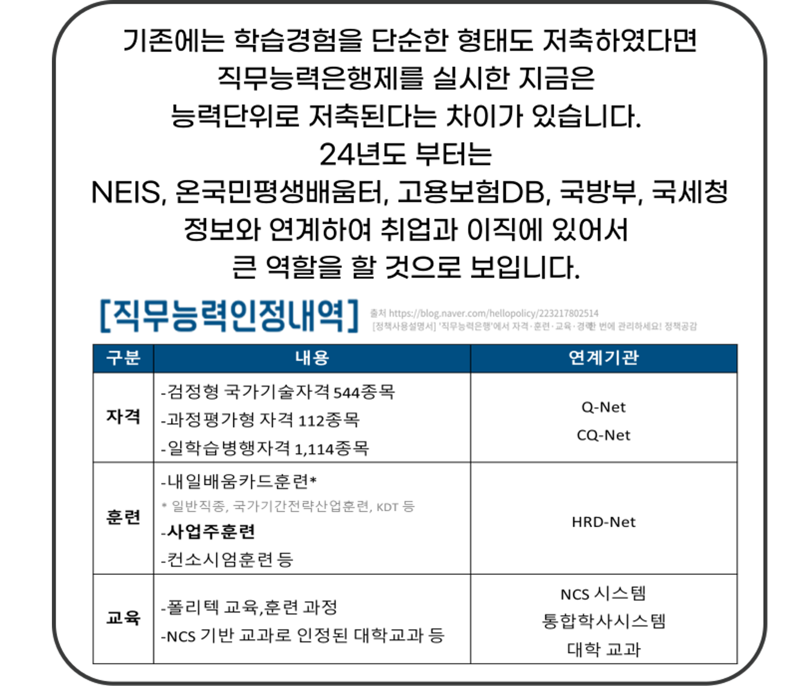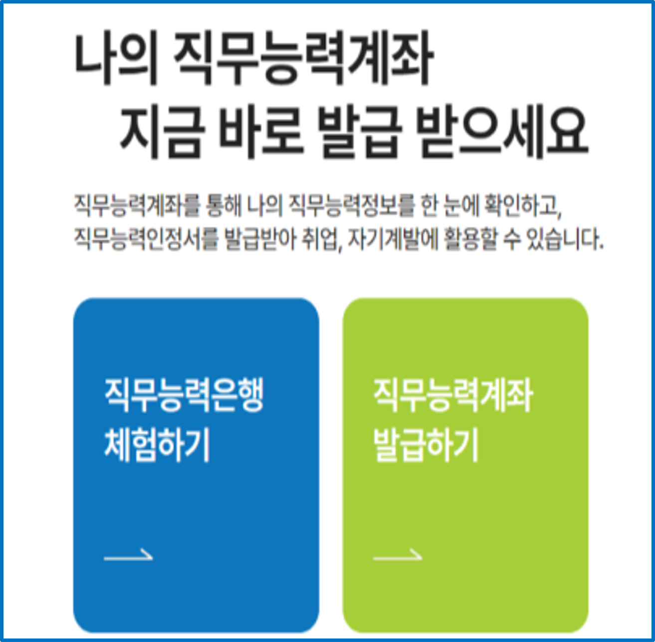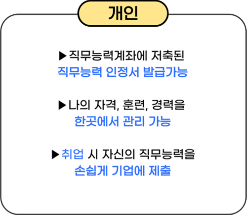 개인이 교육·훈련·자격 등으로 습득한 직무능력을 저축하여 통합 관리하고, 취업, 이직, 승진, 채용 시 기존에 이력서를 대신하여 필요한 때 활용할 수 있도록 직무능력인정서를 발급 받는 제도